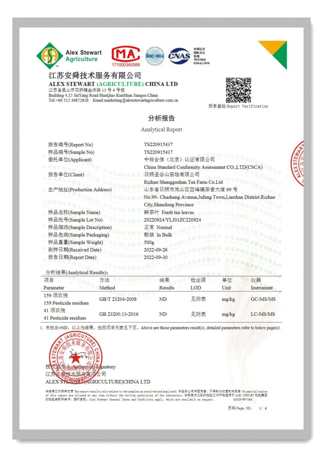 2022年9月24日,圣谷山國際有機(jī)(歐盟有機(jī)、美國有機(jī)、日本有機(jī))認(rèn)證正式開始,期間對圣谷山有機(jī)茶園進(jìn)行現(xiàn)場采樣封存,并進(jìn)行了200項(xiàng)的農(nóng)殘檢測,均為ND(ND=未檢出),圣谷山種植基地原料順利通過了國際有機(jī)認(rèn)證的農(nóng)殘檢測。