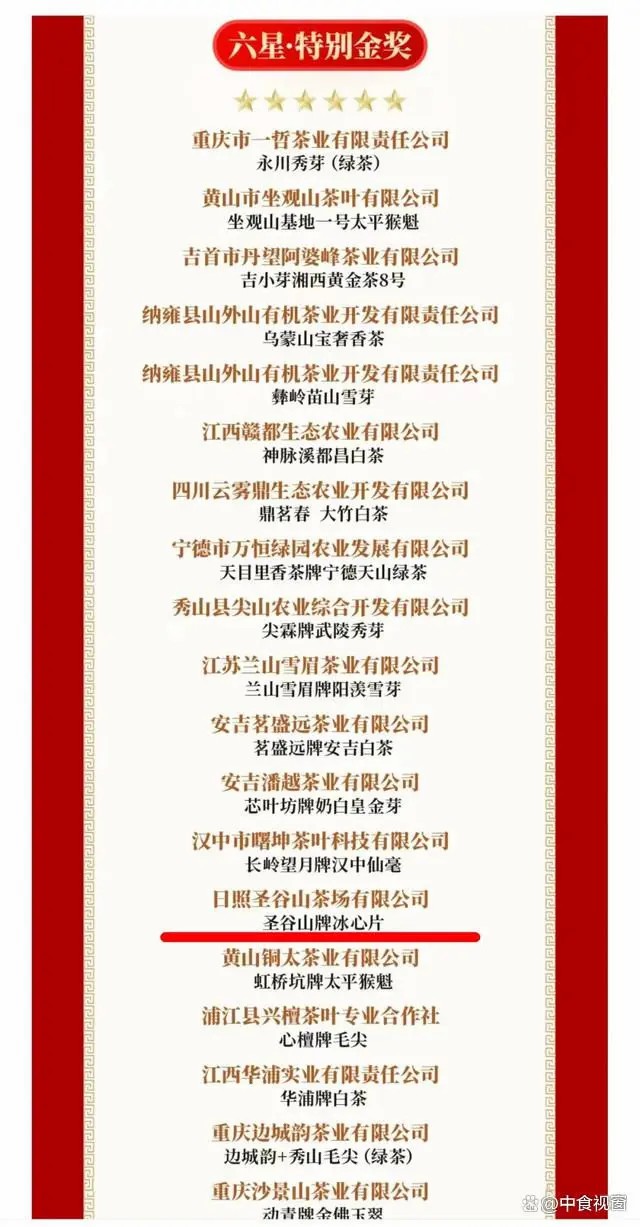 近日,“中茶杯”第十四屆國際鼎承茶王賽·春季賽獲獎名單揭曉,圣谷山牌“冰心片”入選綠茶組獲獎名單,獲評六星·特別金獎,日照圣谷山茶場為山東唯一獲此殊榮茶企。
